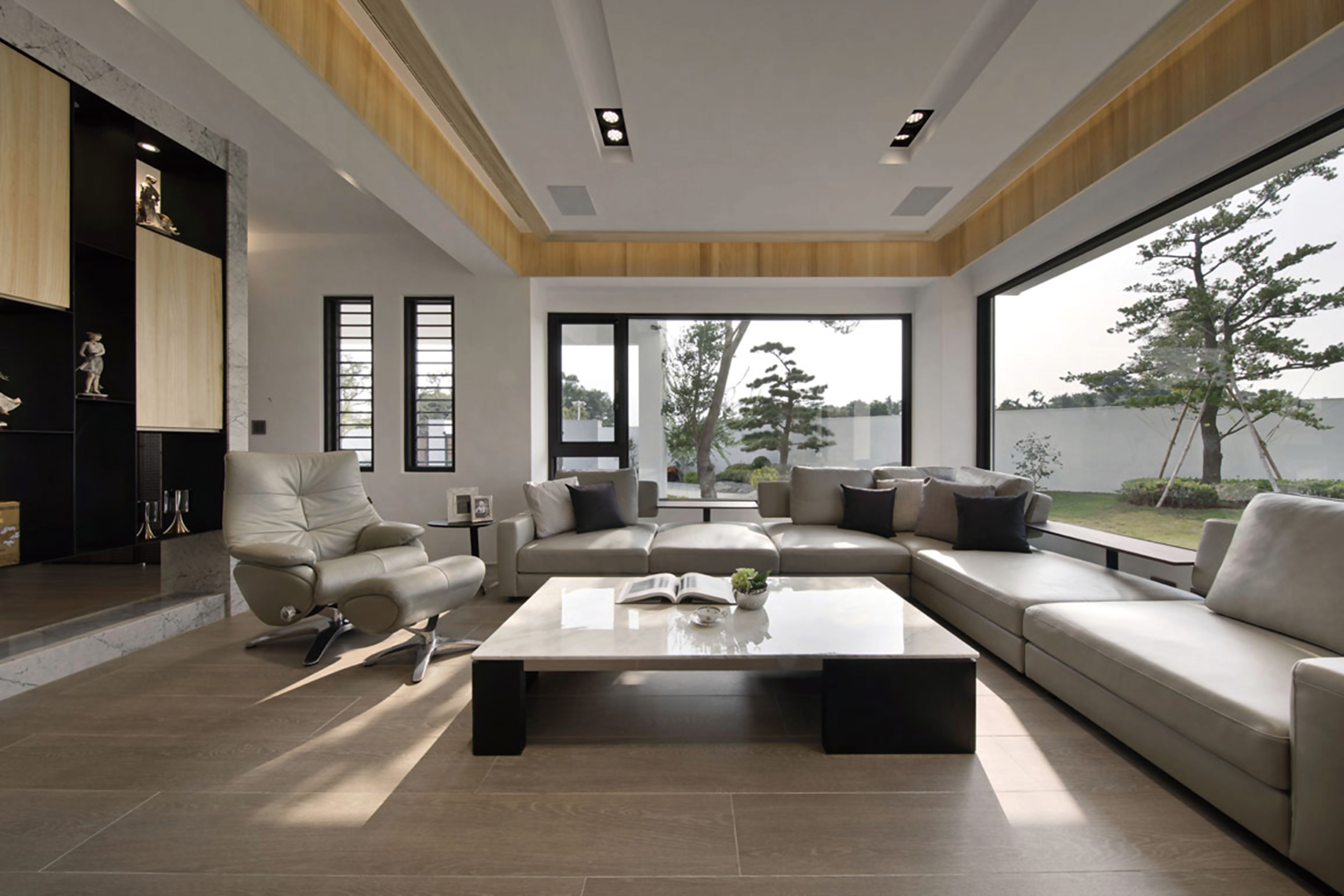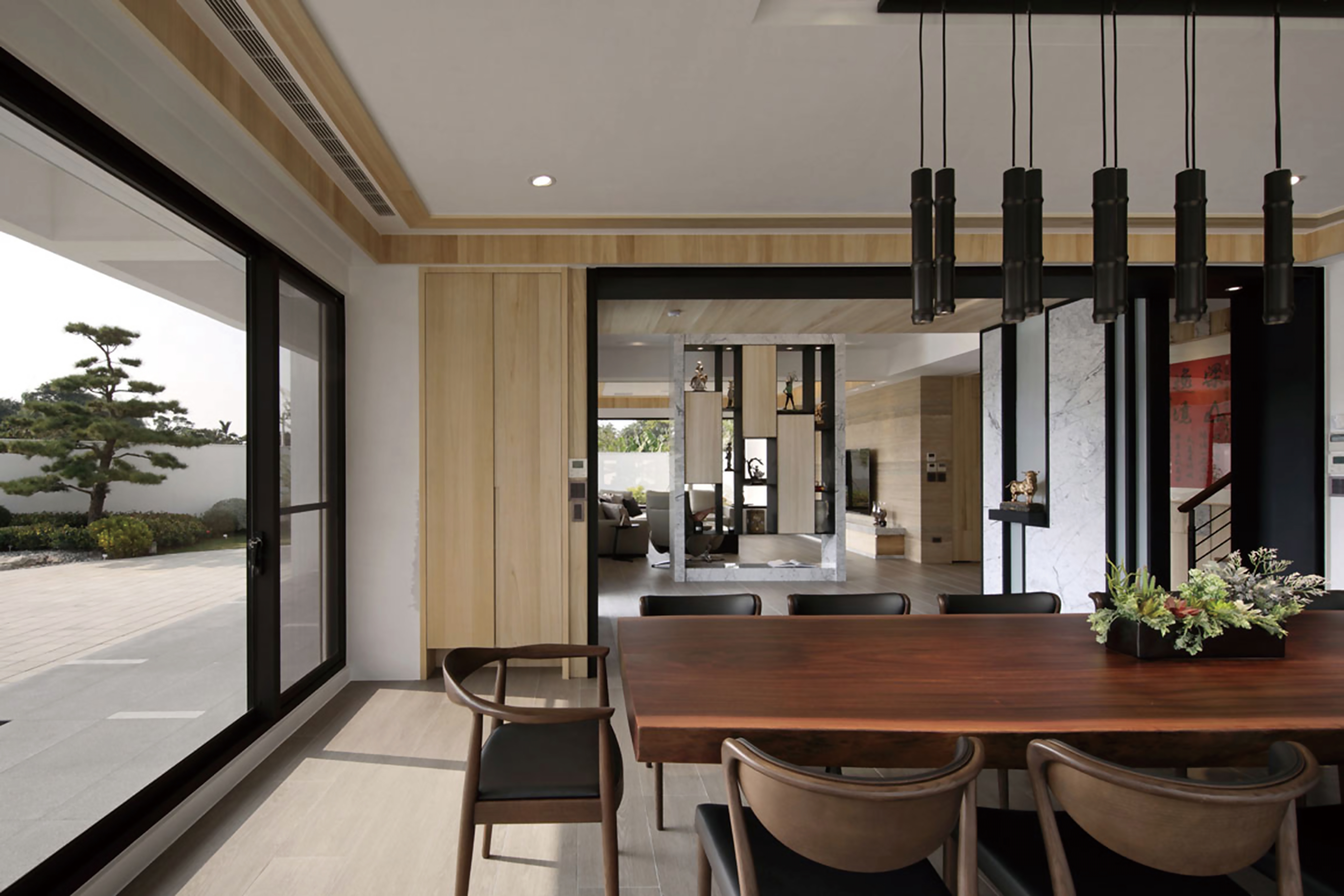其餘房間則以實木貼牆呈現相同色澤、不同質感,在不同的設計手法中落實概念的一致性。讓山開闊、可安歇的意境,不只於外,更落實於空間的每個角落。