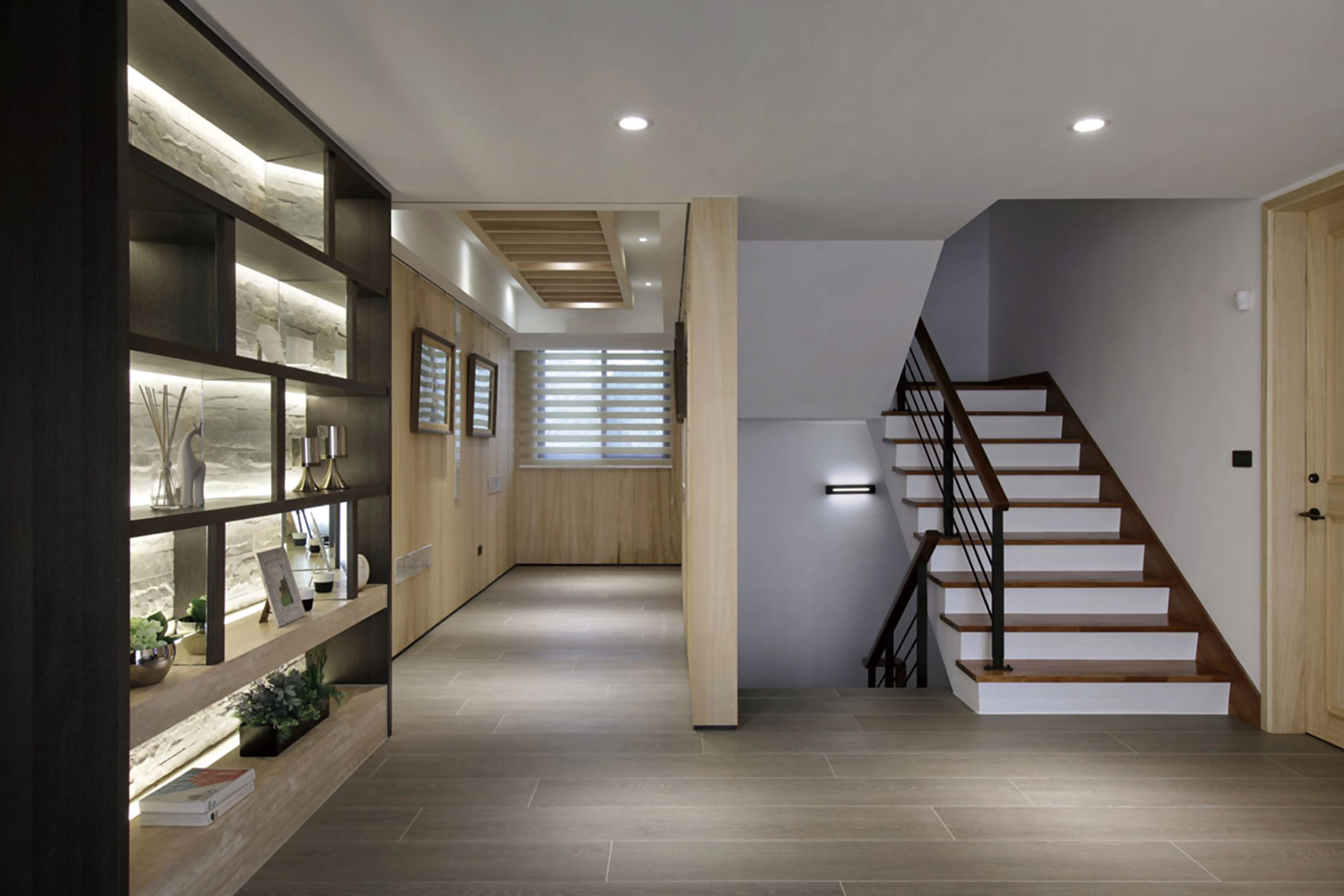 在二三樓私人場域,我們運用藝廊的概念來處理過道空間,格柵式天花與投射燈的搭配加上端景窗,充足的光線讓畫作於此展現,使人們佇足。接續的剩餘空間以文化石展示牆延伸藝廊概念,讓一段行走的過程更具意義。