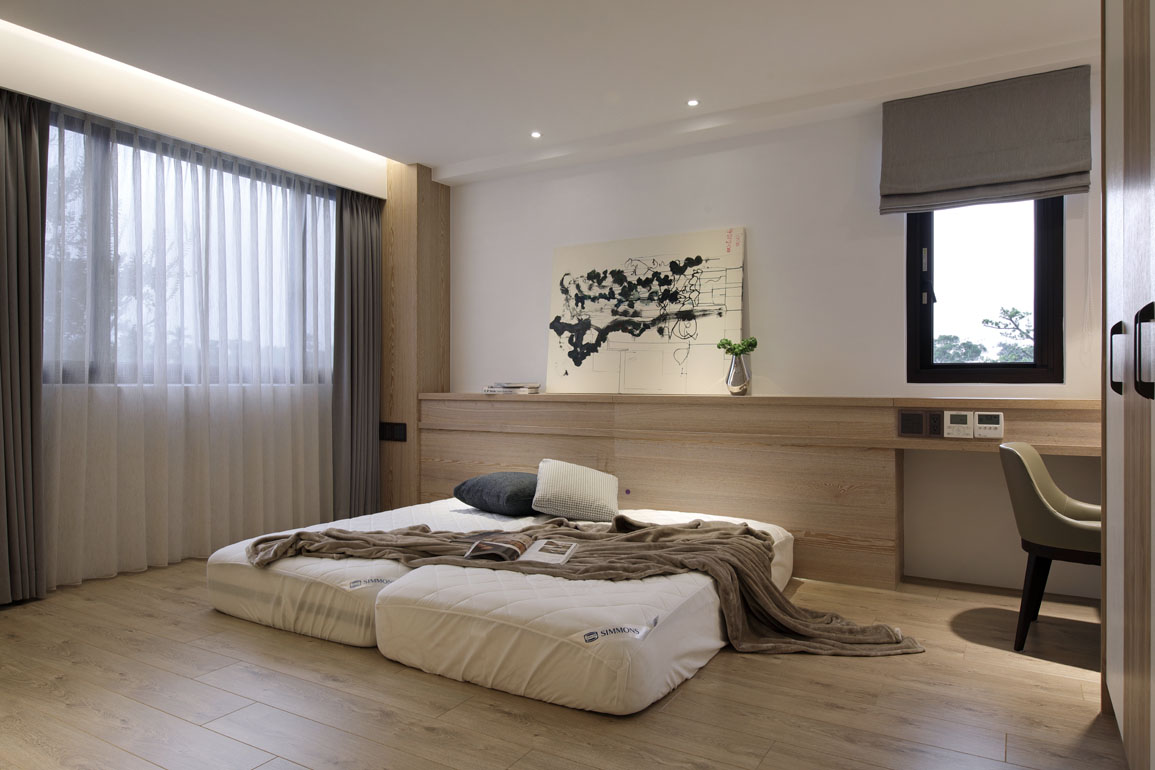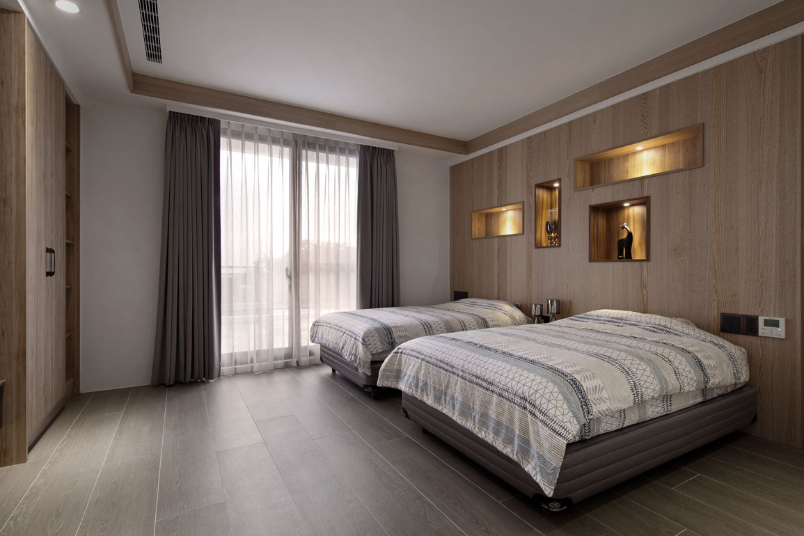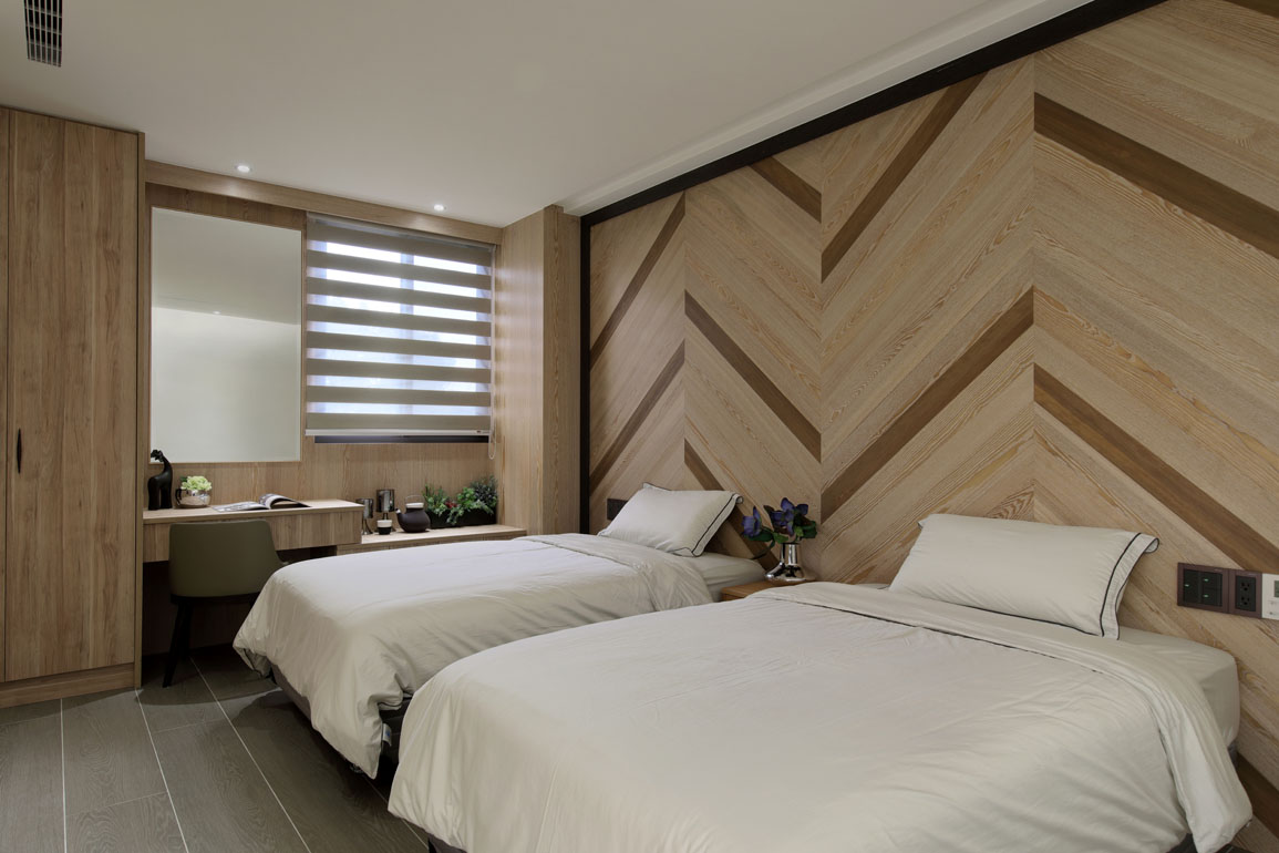 每間臥房皆使用原木色調作為主軸,再以不同的材質變化與結構尋求差異。