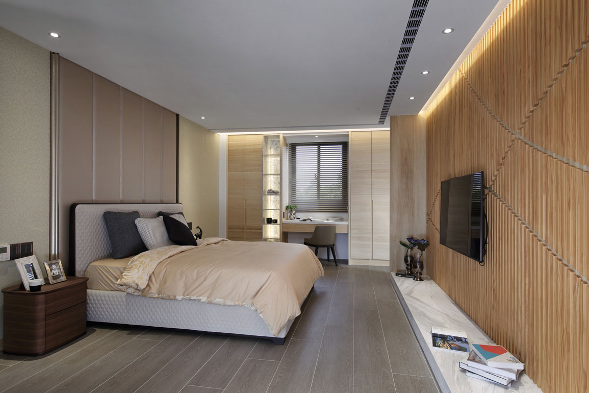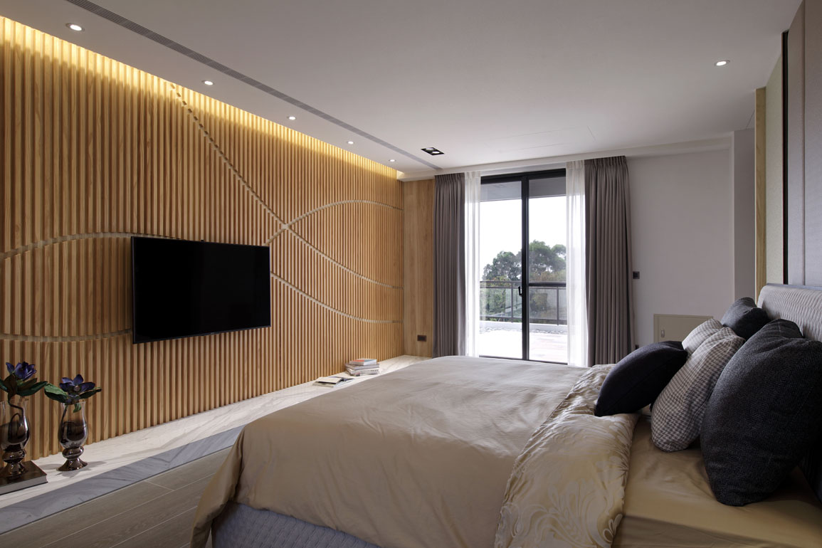 主臥室電視牆以西卡蒙拚木構成,然而大膽利用曲線切割組構後,創造流暢圓滑的視覺感。