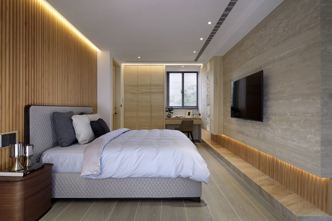 次臥同樣以西卡蒙拚木構成床背,然而與電視牆呼應的直立式設計更凸顯山間意境,色調溫暖的米白大理石牆讓整體空間色彩配置具有一致性。