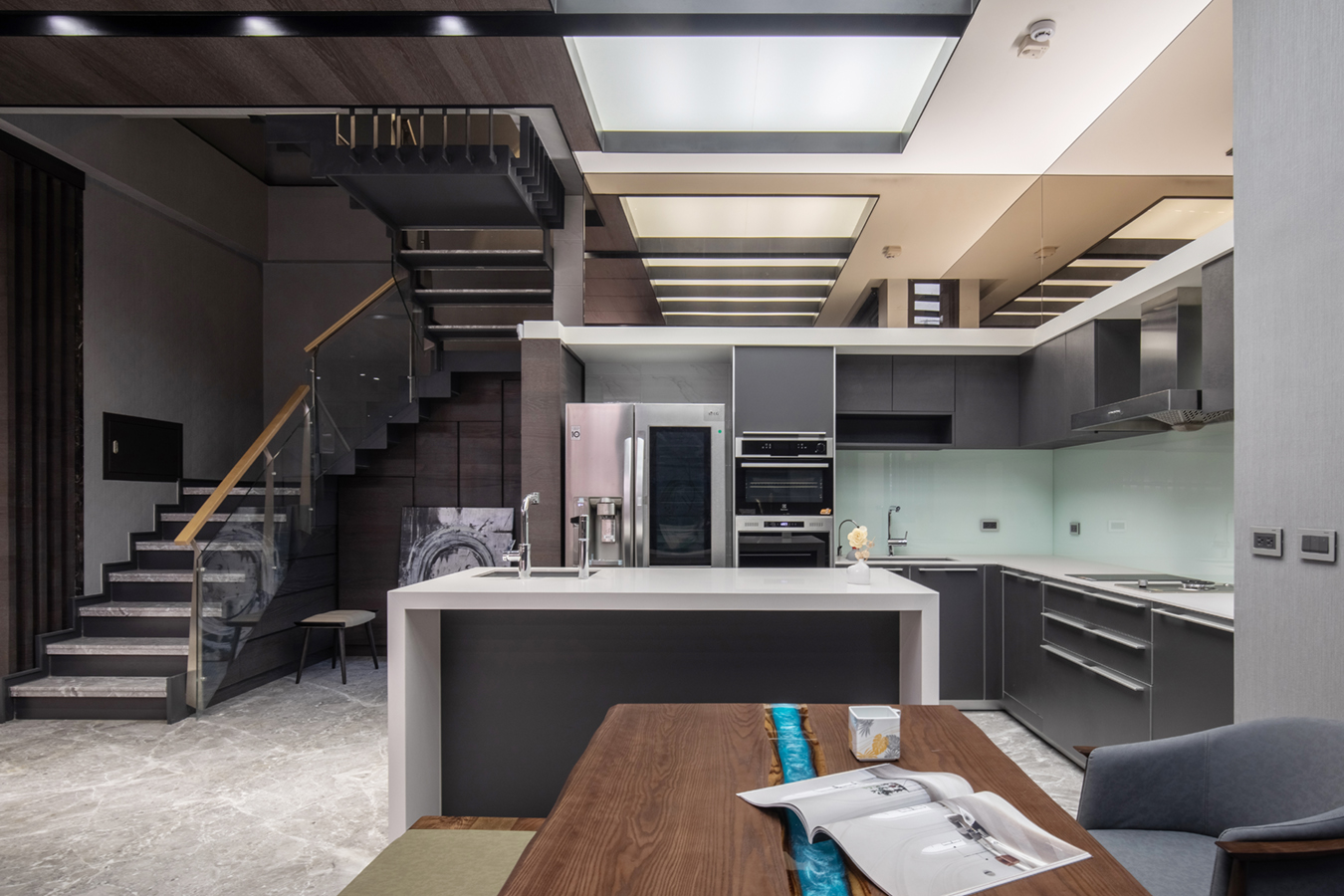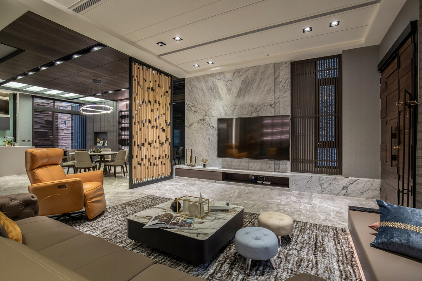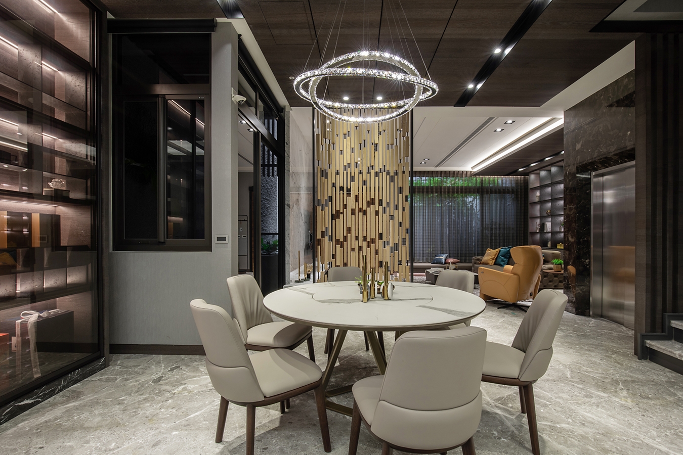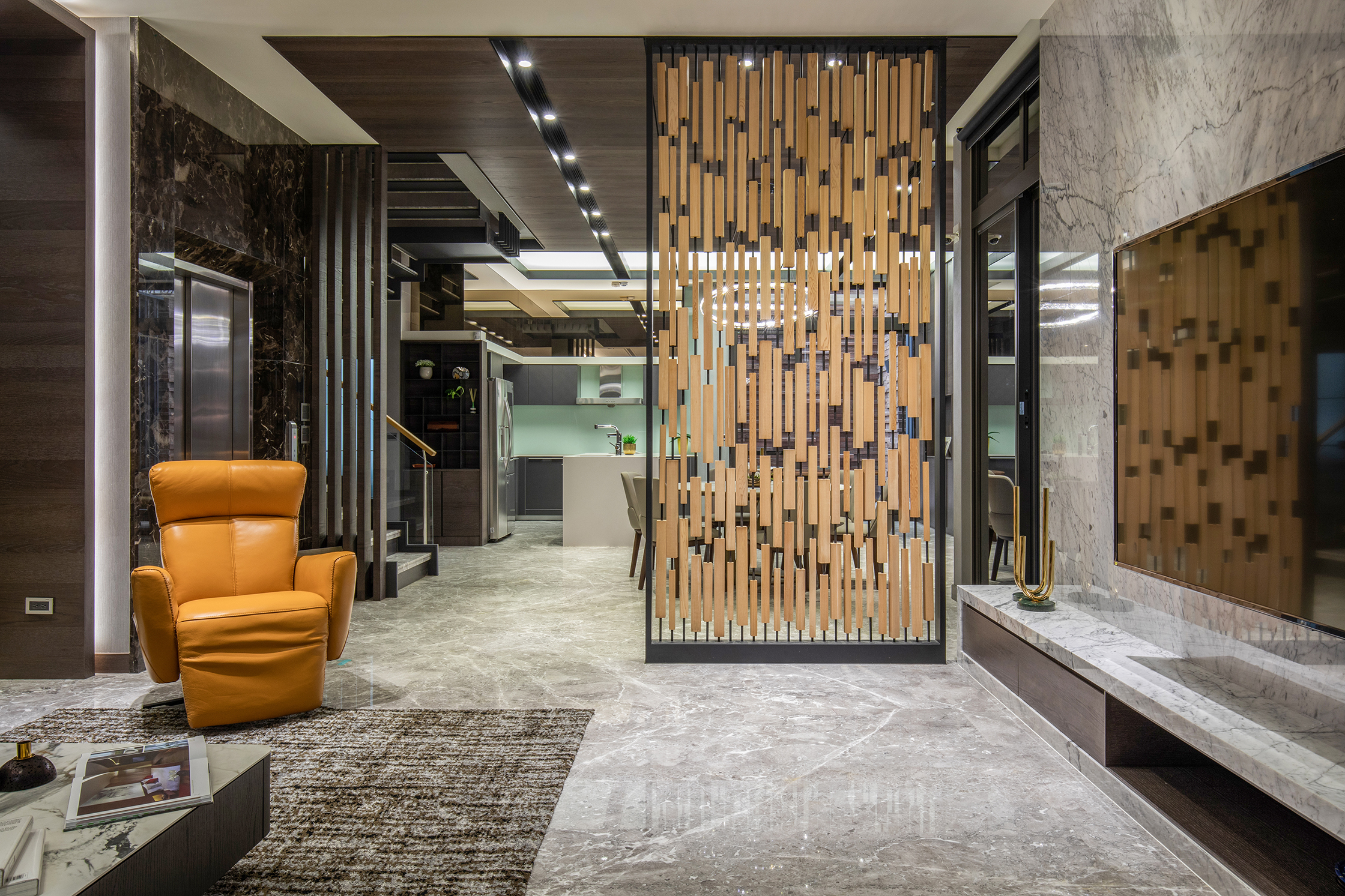 所有人共享的一樓,我們使用大氣磅礡與低調奢華來定義他 : 進入室內之後是客廳與餐廚共構的開放空間。帶有潑墨紋理的大理石建構了空間的基本調性,從牆面地面到天花,相互輝應,深棕色鋼刷實木貼皮的大門去除掉石材較冰冷的氣息,設計上只留下必要的線條,留白,迎賓的大氣磅礡得以應運而生。在空間過度的處理上,利用鋼條串起縝密的木塊,形成具韻律感的入口屏風,既能區隔出客廳與餐廚的領域,具有視覺穿透與遮蔽性的同時,兼顧空氣的流通。